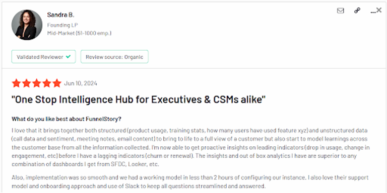 Customer review highlighting FunnelStory's comprehensive intelligence hub capabilities.