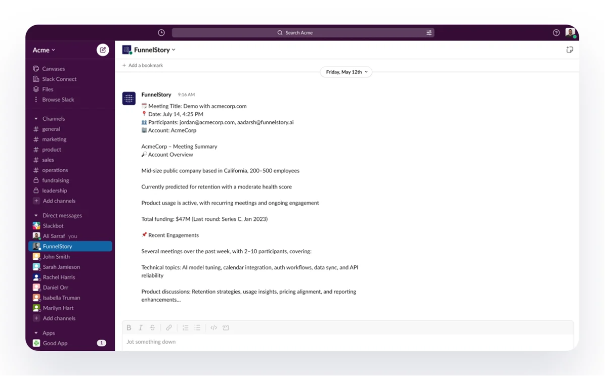 FunnelStory AI doesn't stop at compiling summaries. It's designed to integrate seamlessly into your workflow. Need information on the fly? Our AI responds to queries over Slack or Teams, ensuring you're never more than a message away from the needed insights. Check out our AI Tasks feature to see how we're eliminating busywork in customer success.