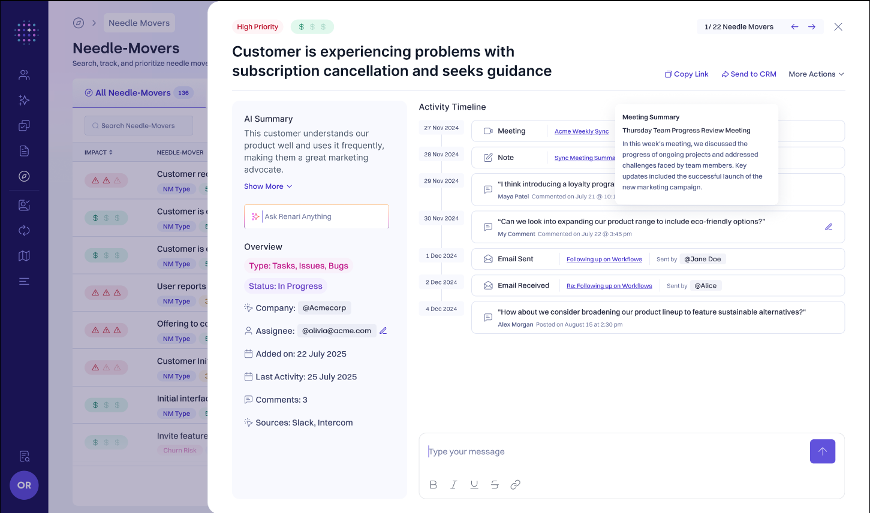 Utilizing generic metrics, such as product usage KPIs accessible through any software tool, will not create any impact. Instead, focus on addressing more substantial concerns like retention and churn. Our Needle Movers solution helps you focus on what drives customer retention.