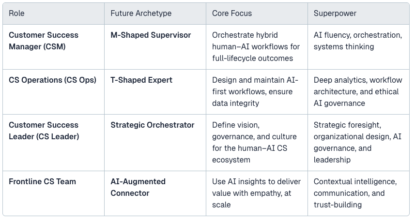 In my view, these archetypes can collectively serve as a framework to evolve traditional CS teams into adaptable networks, with humans steering, specializing, and enhancing AI capabilities.