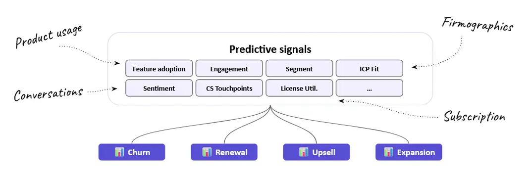 Health Scoring | AI blends adoption, support, and sentiment data into predictive health scores. | Unlike static formulas, these scores adapt continuously, surfacing risks early. |